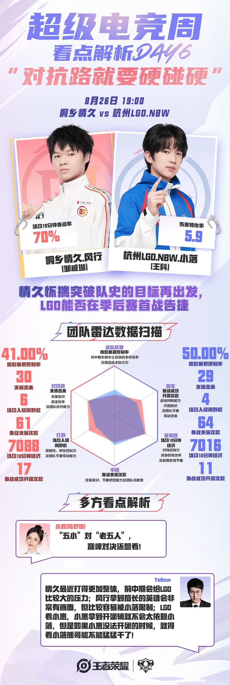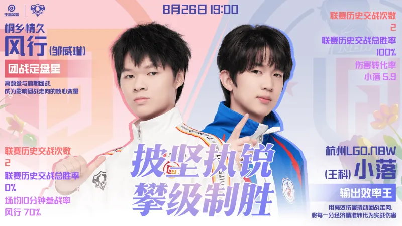 初入季后赛就在巅峰对决战胜对手的桐乡情久-王者荣耀 对阵用胜利收官自己常规赛第三轮的杭州LGDNBW ,谁能在季后赛更进一步,站上败者组第三轮的舞台?