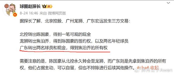 据媒体人球圈赵探长报道,北控、广州和广东发生三方交易,广东队转出两名球员和现金,得到焦泊乔的所有权。而据坊间消息,这两位球员很有可能就是青年队的彰华非和夏振峰。
